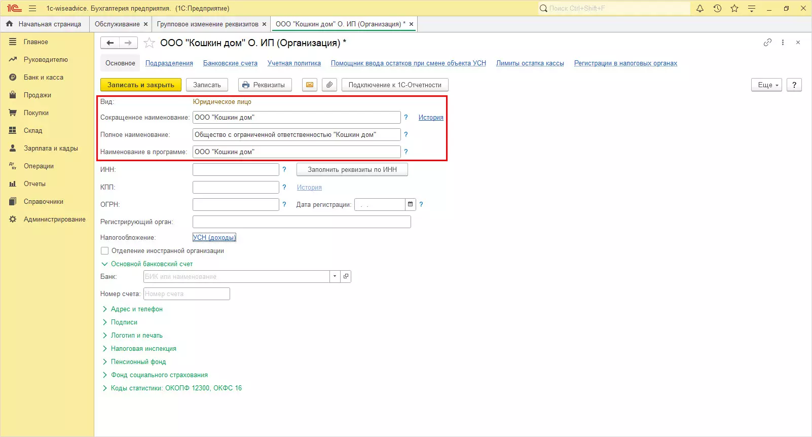- Как изменить вид в карточке организации с физического лица на юридическое