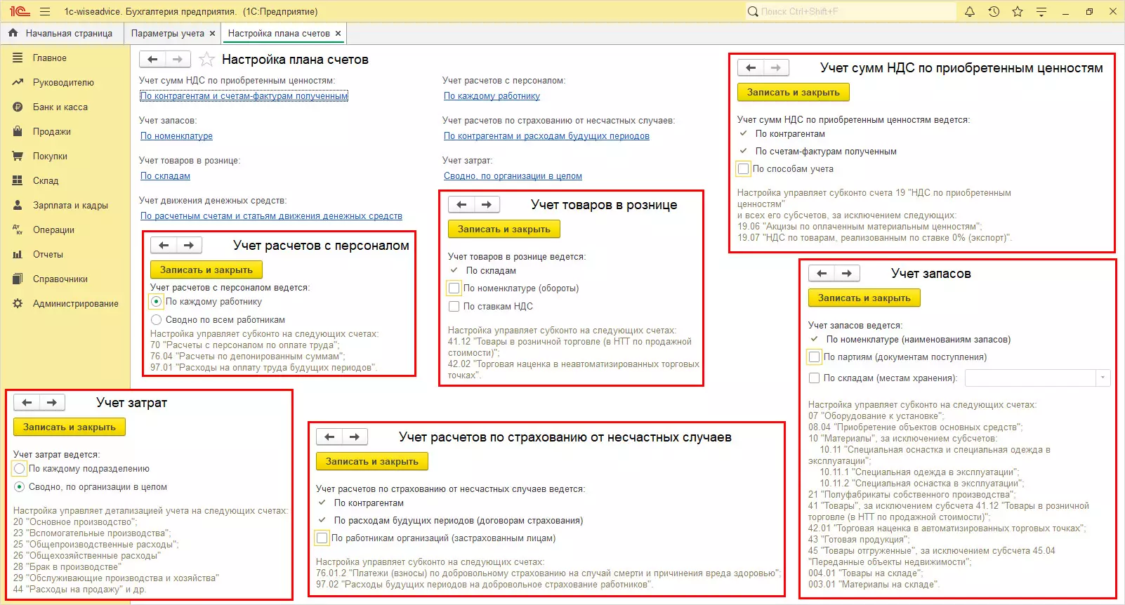 Самые большие блоки настроек это – (1) – «Настройка плана счетов» и (3) – «Настройки зарплаты». Настройка плана счетов включает в себя несколько разделов настроек: