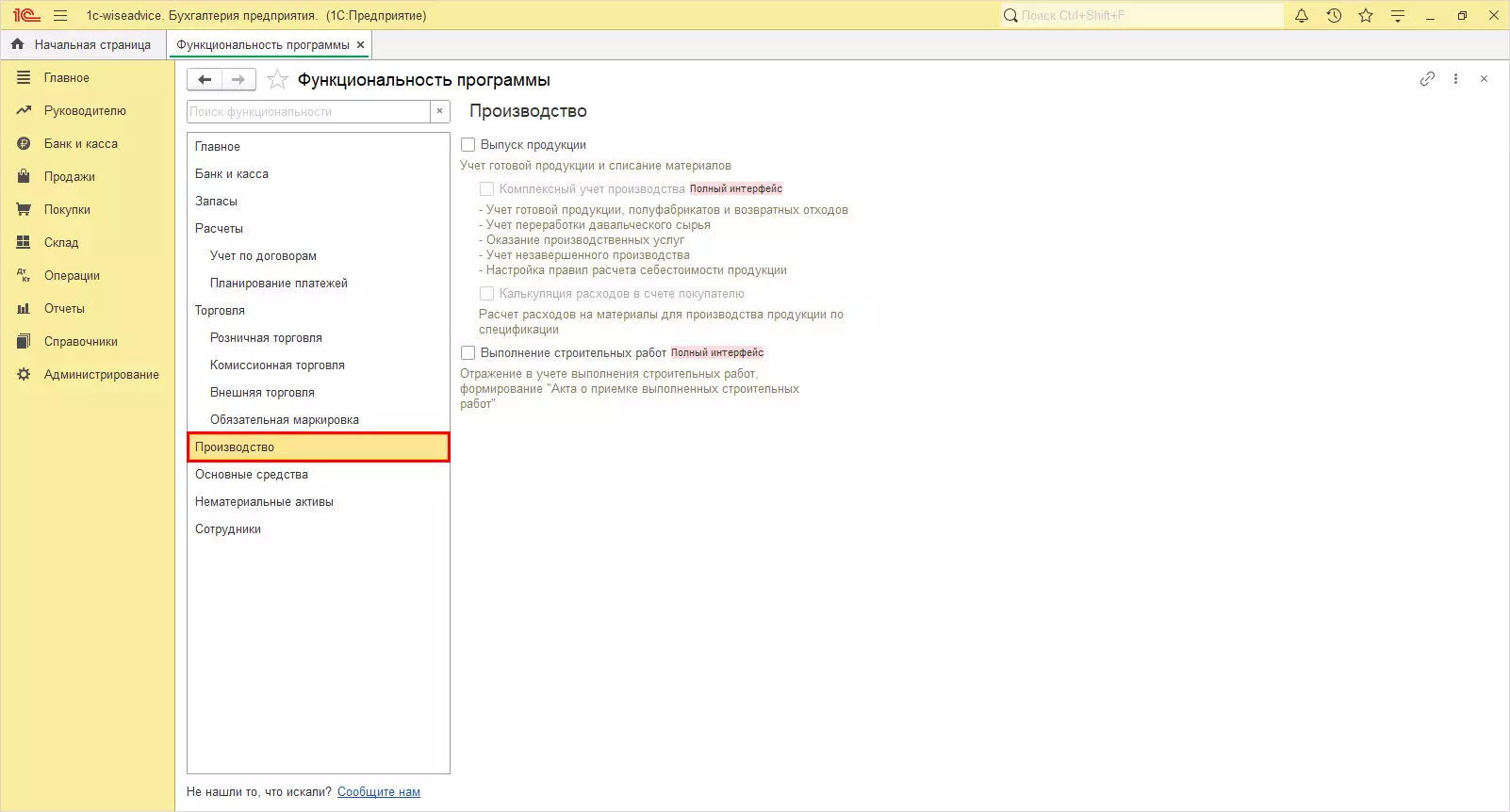 Блок "Производство" в настройках 1С:Бухгалтерия