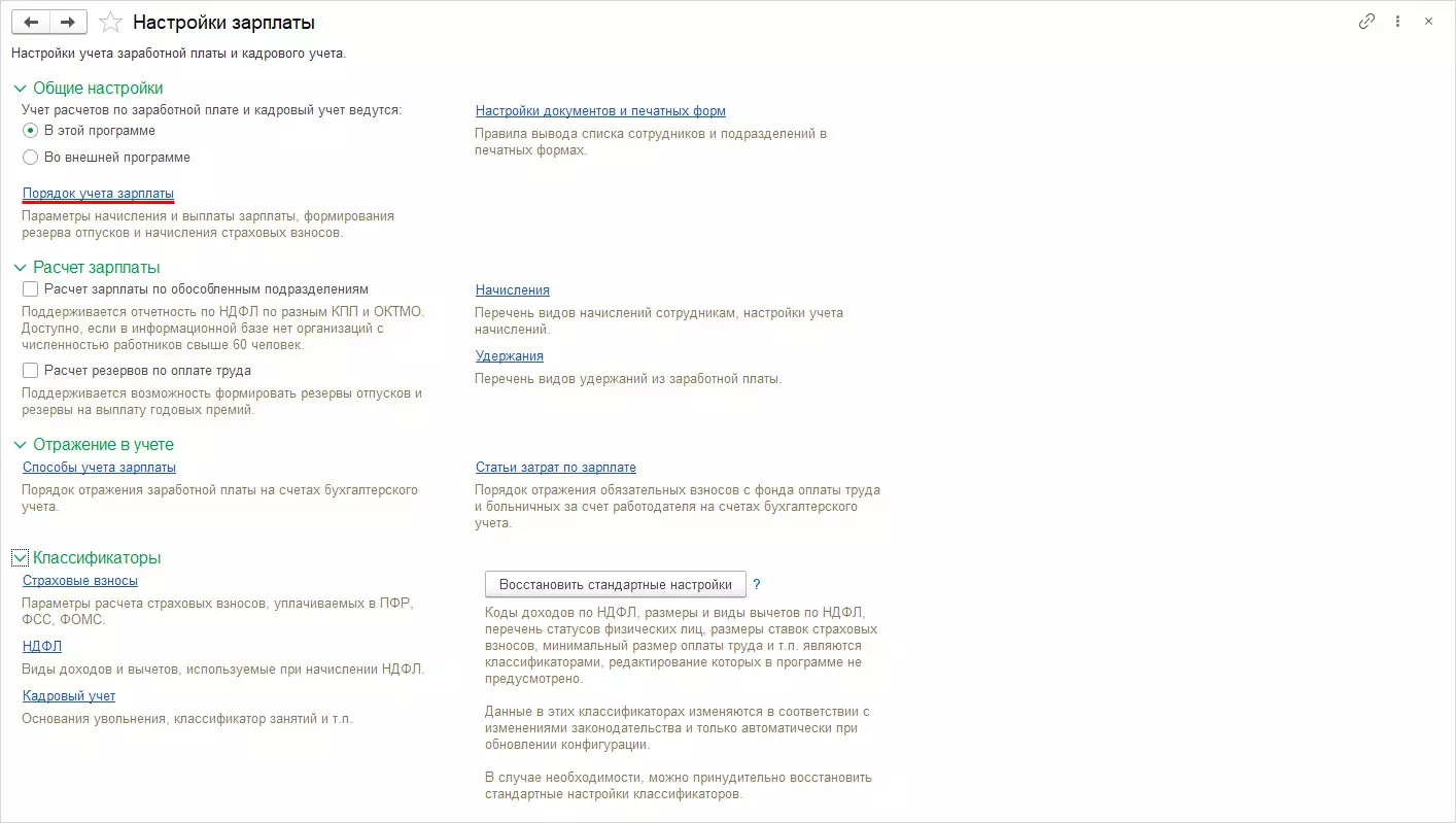 Рекомендуется пройтись по всем разделам настройки и установить необходимые галочки и переключатели. Если пользователем активирован раздел учета зарплаты в 1С:Бухгалтерия предприятия, то перед выполнением операции начисления, загляните в раздел «Настройки зарплаты».
