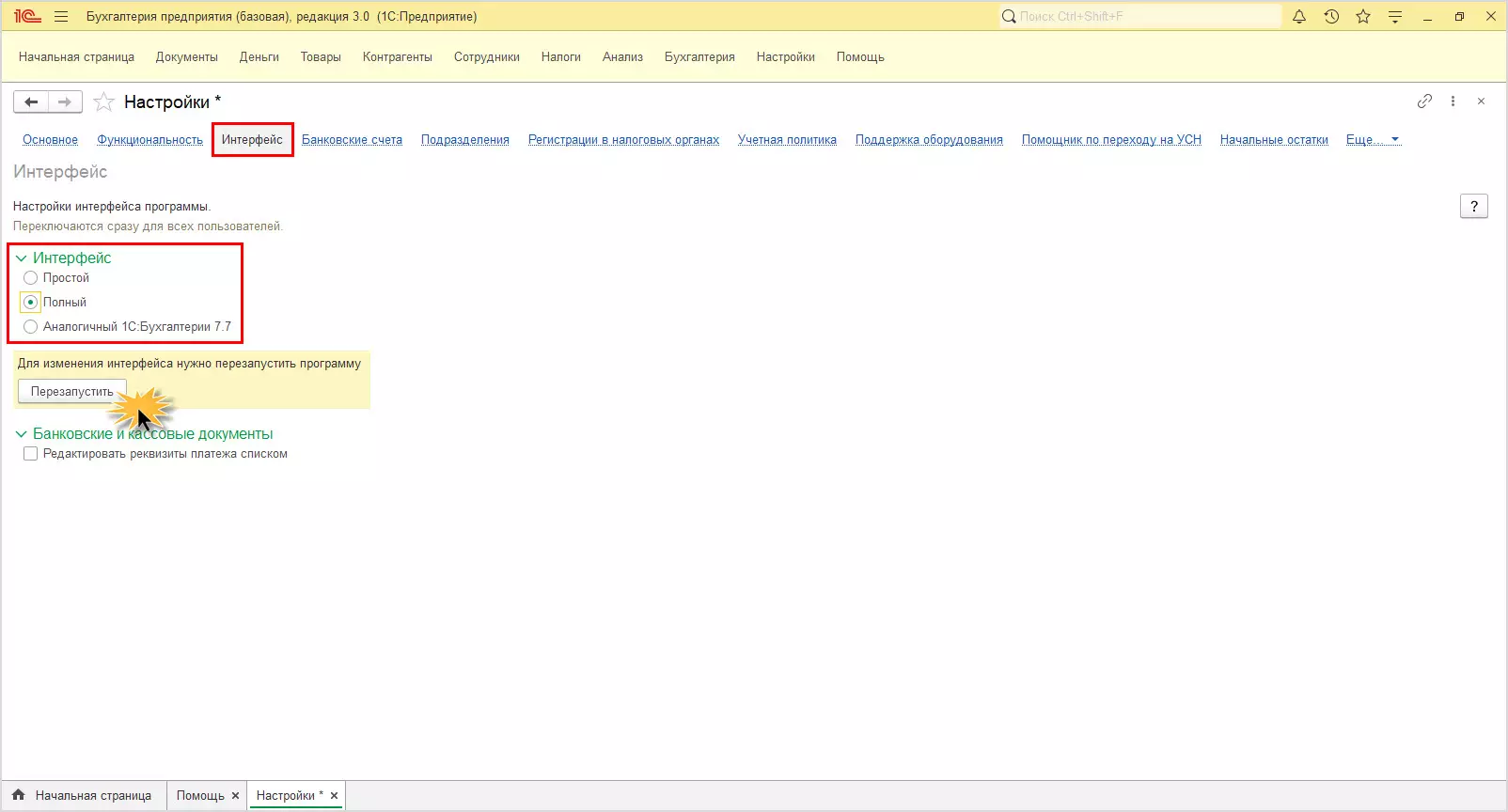 Для перехода в привычный интерфейс с боковым меню, установите переключатель в положение «Полный» и перезапустите программу.