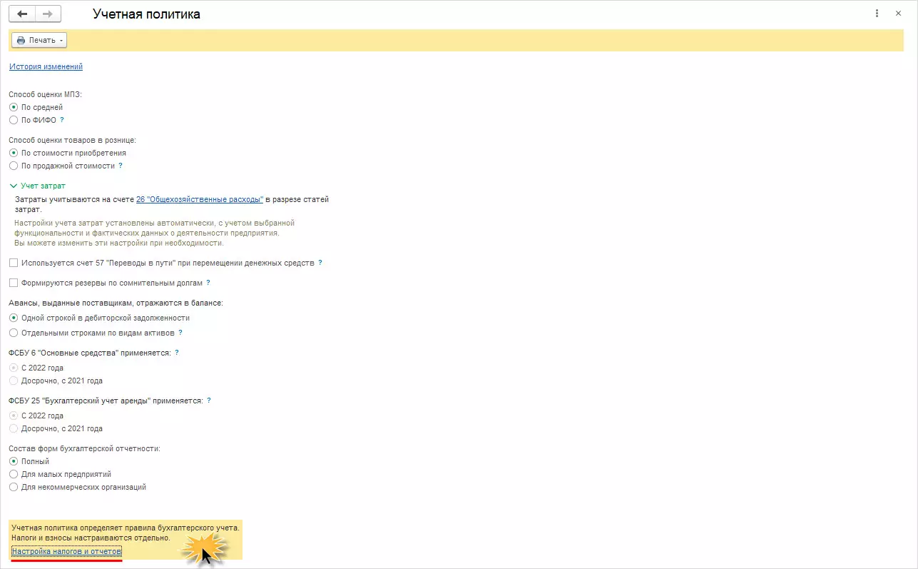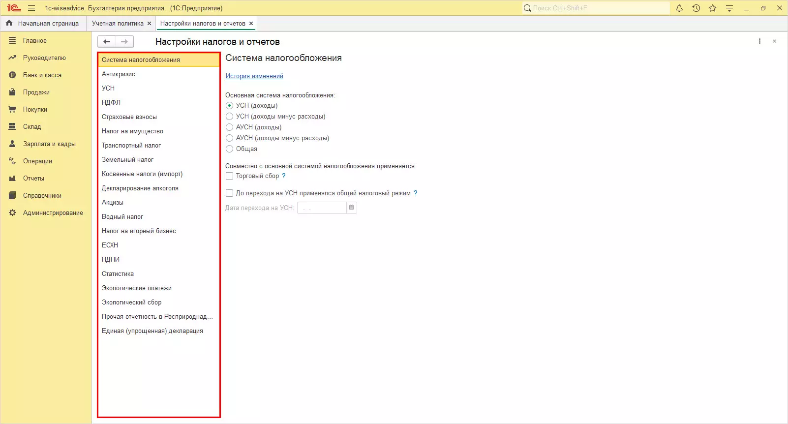 Кликнув по гиперссылке «Настройка налогов и отчетов», пользователю станут доступны разделы настройки налогов и отчетов по разделам.