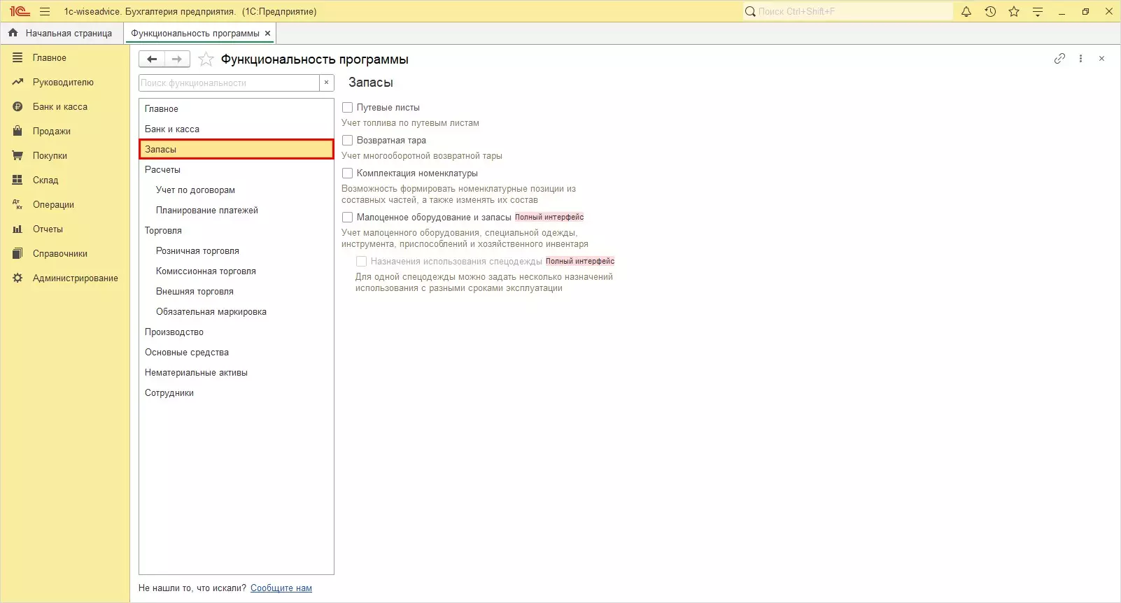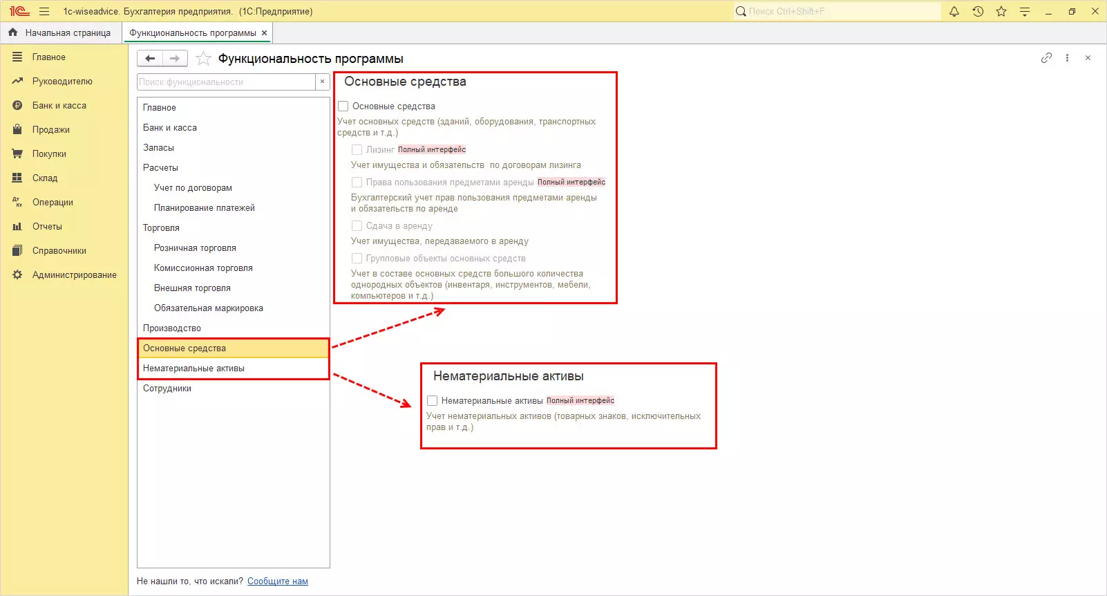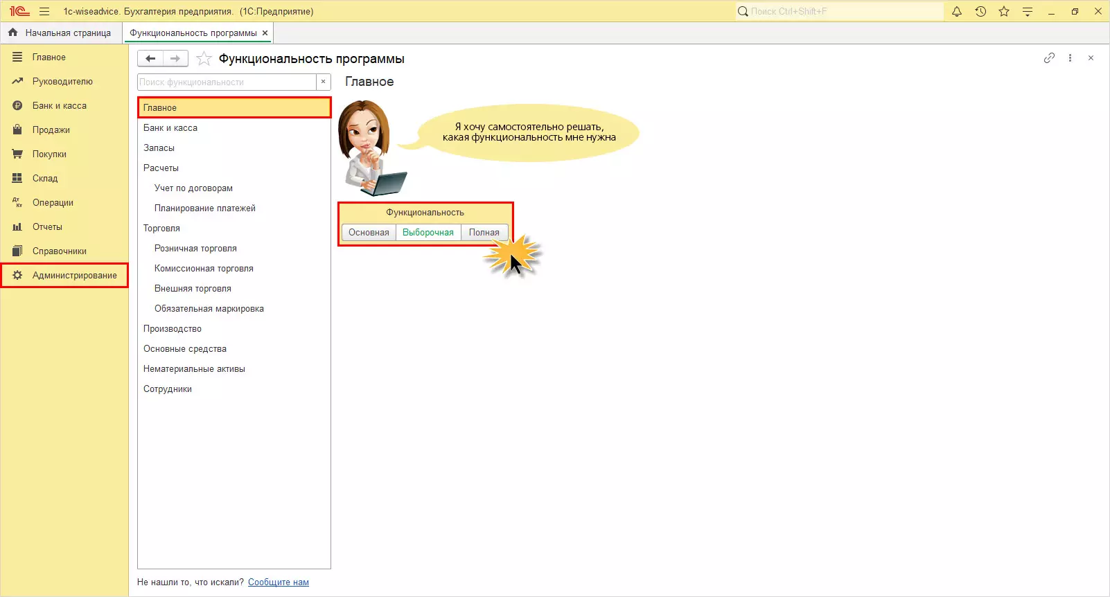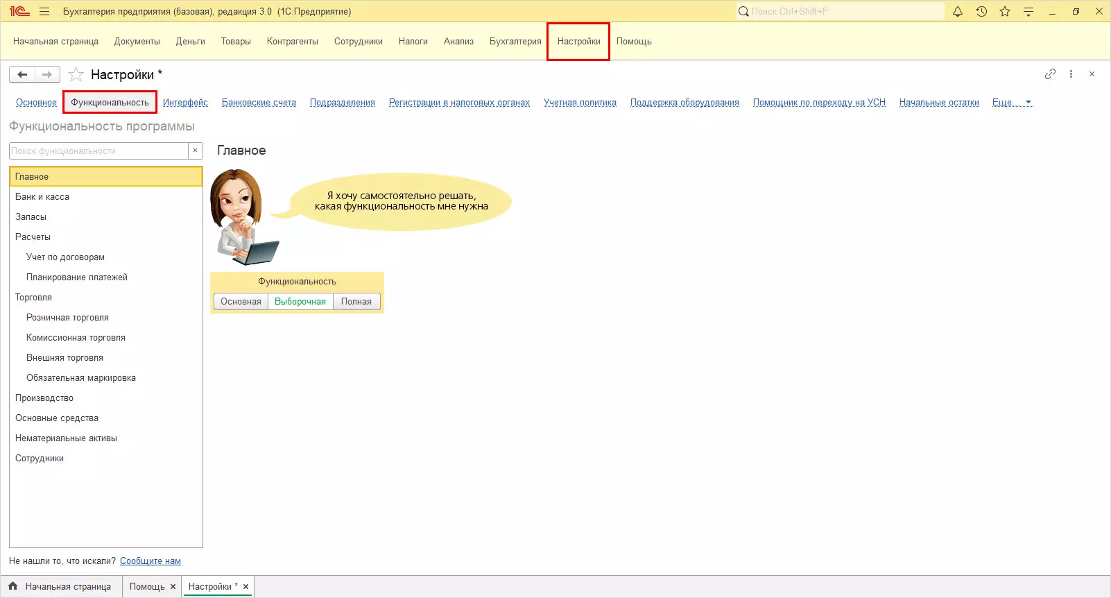 Выбирая вариант функциональности, пользователь может задавать собственные настройки 1С, не перегружая систему включением лишних модулей – «Выборочная функциональность». «Полная функциональность» используется, когда необходимо включить все имеющиеся возможности программы. «Основная» – включение минимальных опций 1С.