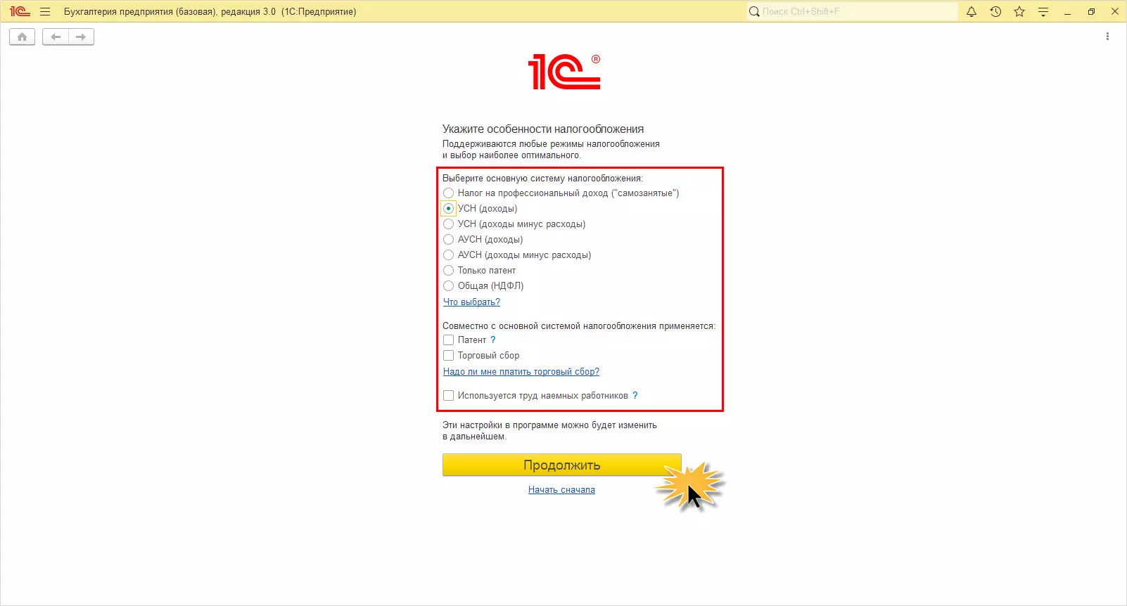 Окно 4. Укажите систему налогообложения. Если в организации есть наемные сотрудники, установите одноименную галочку.