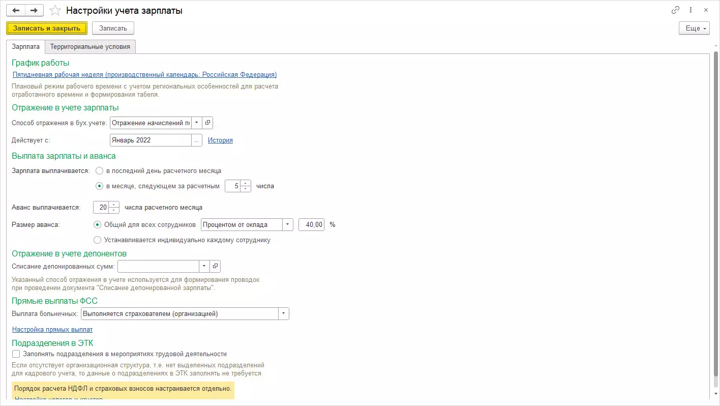 Для дополнительных настроек заработной платы, таких как отражение в учете по умолчанию, выплата зарплаты и аванса, определение территориальных условий и действия их надбавок, перейдите по гиперссылке «Порядок учета зарплаты».