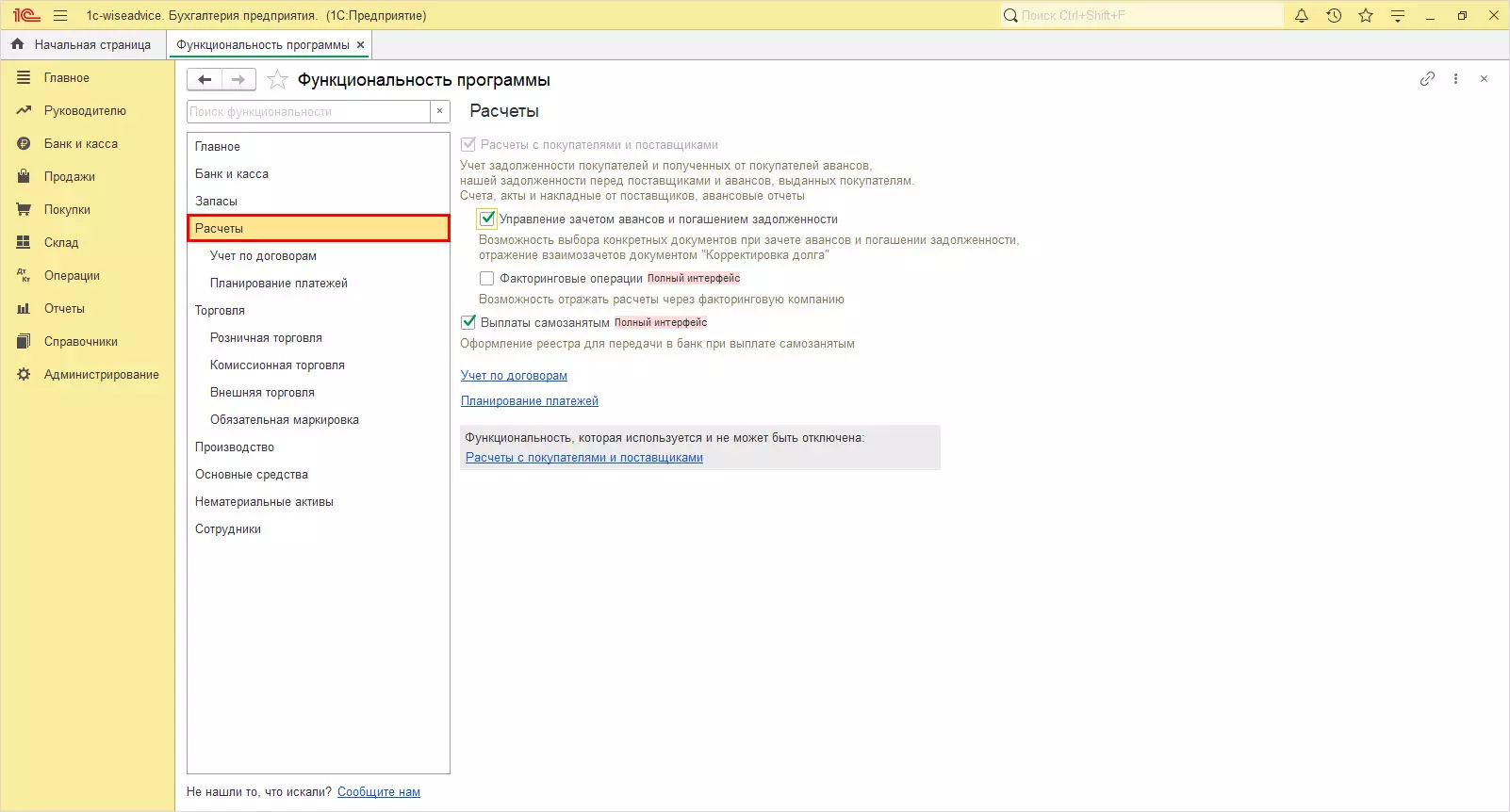 Настройки раздела и подразделов "Расчеты" в 1С:Предприятие Бухгалтерия