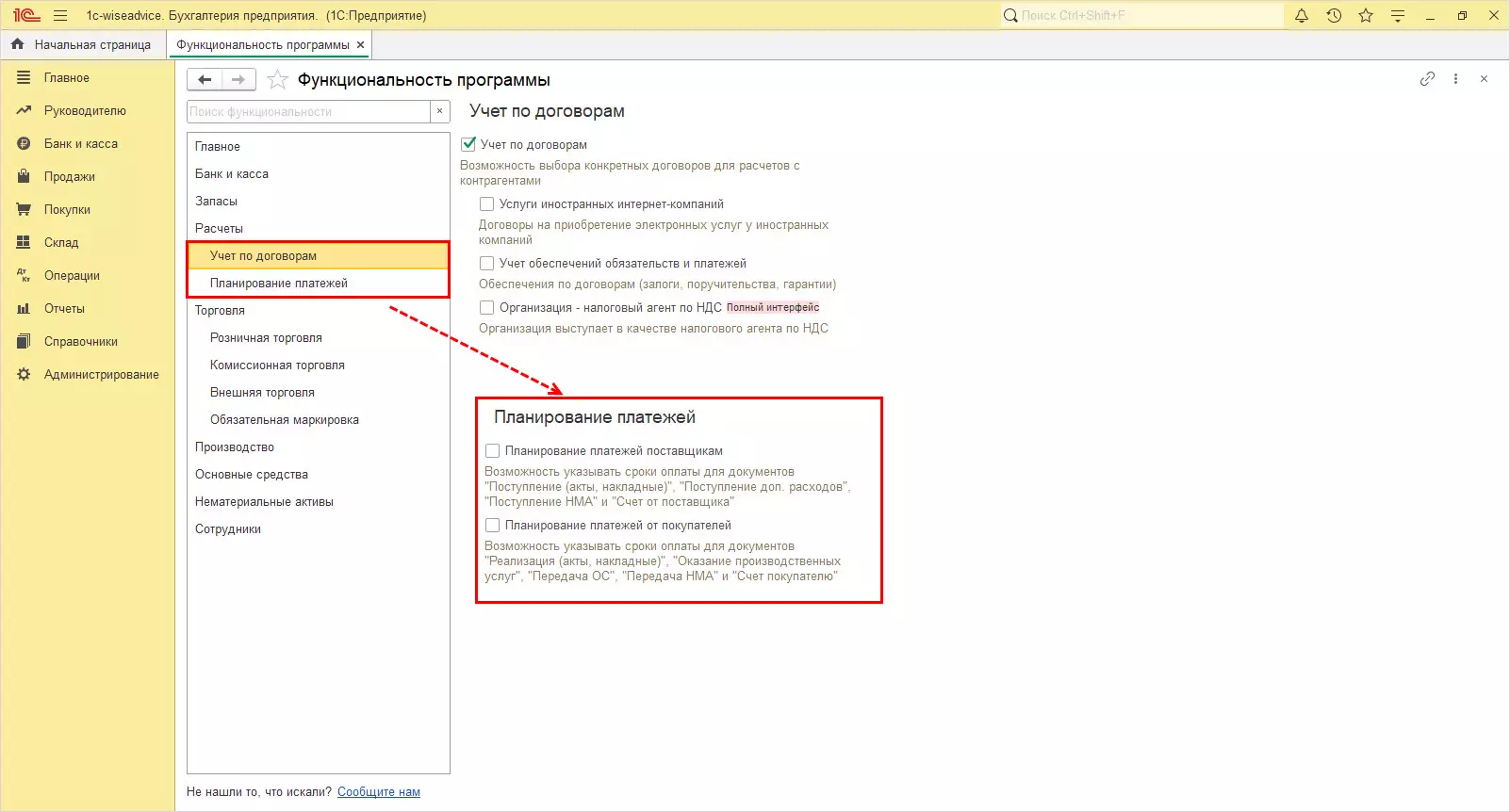 Подразделы «Расчеты» – «Учет по договорам» и «Планирование платежей».