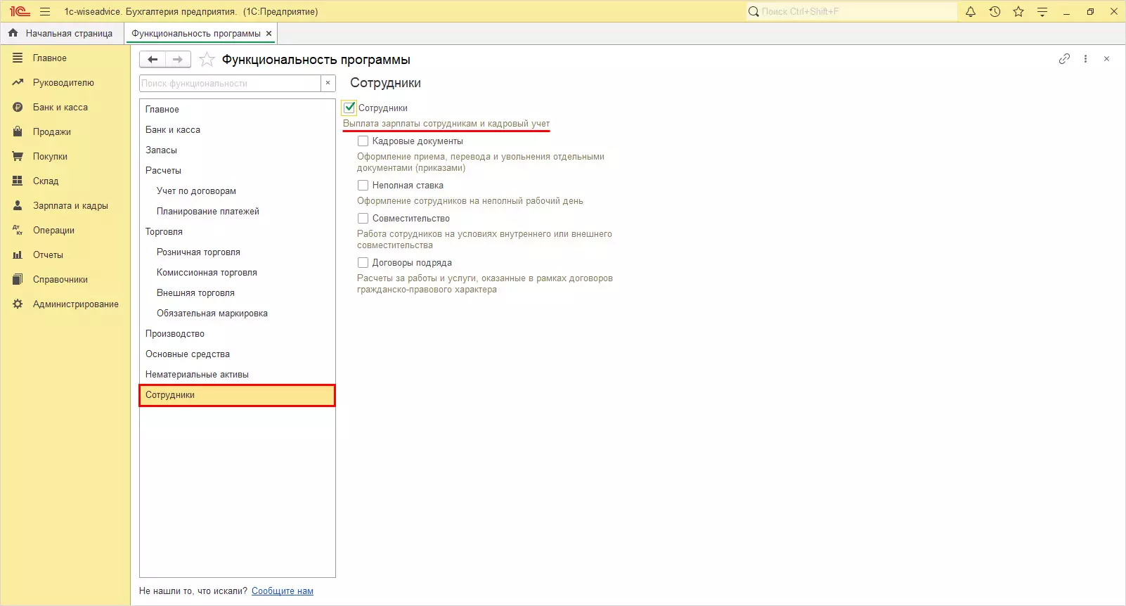 Например, после включения настройки «Сотрудники» пользователю станут доступны для включения дополнительно: