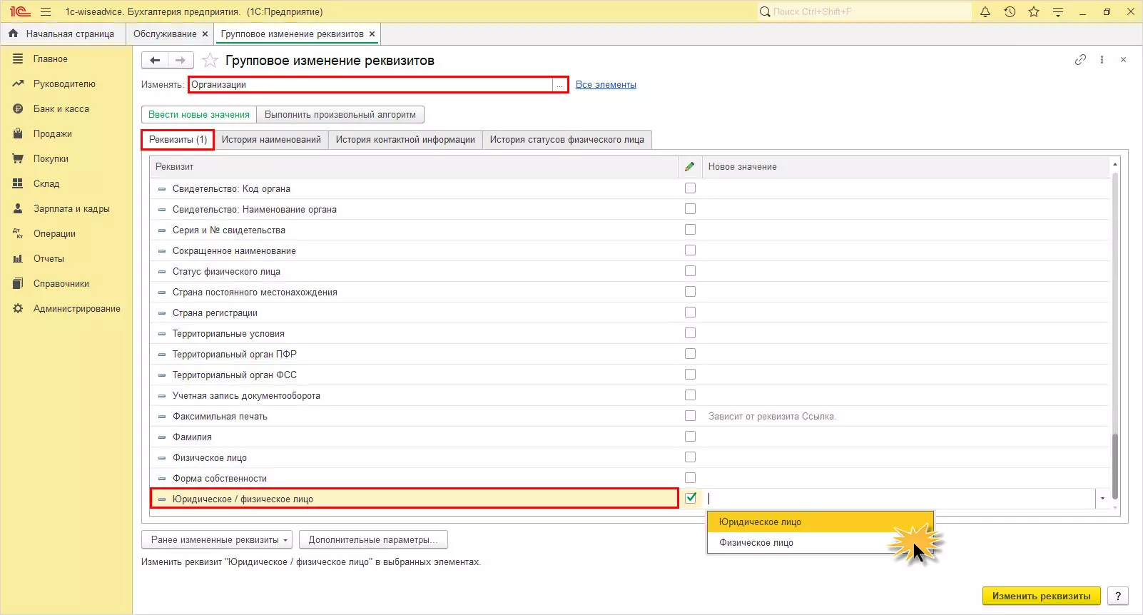 В поле «Изменить» выберите «Организация». Прокрутив вниз, установите галочку изменения реквизита «Юридическое/физическое» лицо и установите значение, на которое надо поменять. В нашем примере – на юридическое. Нажмите «Изменить реквизиты».