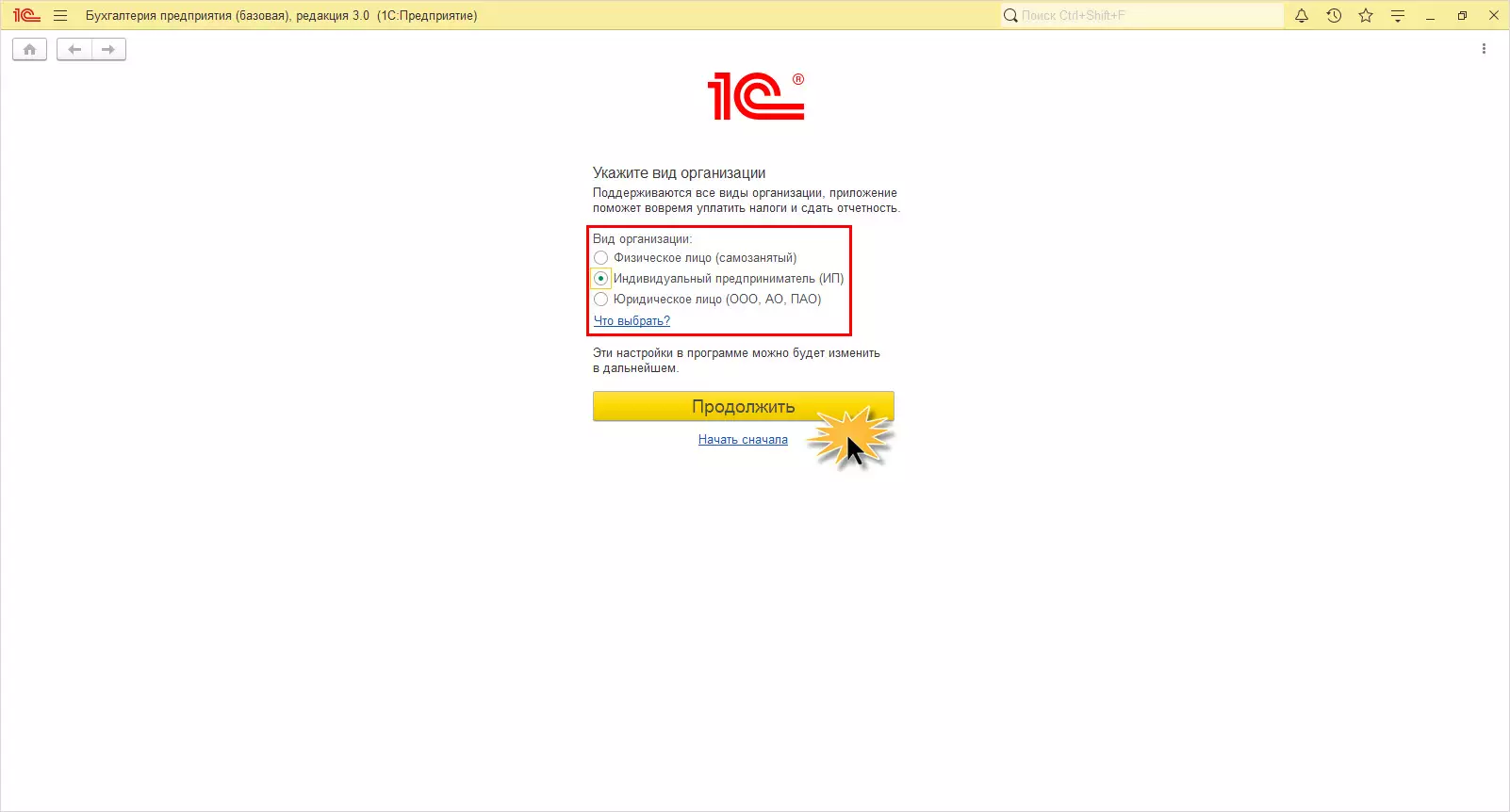 После установки и запуска 1С:Бухгалтерия система автоматически предложит пользователю выполнить первоначальную настройку. Рассмотрим действия первого запуска пошагово.