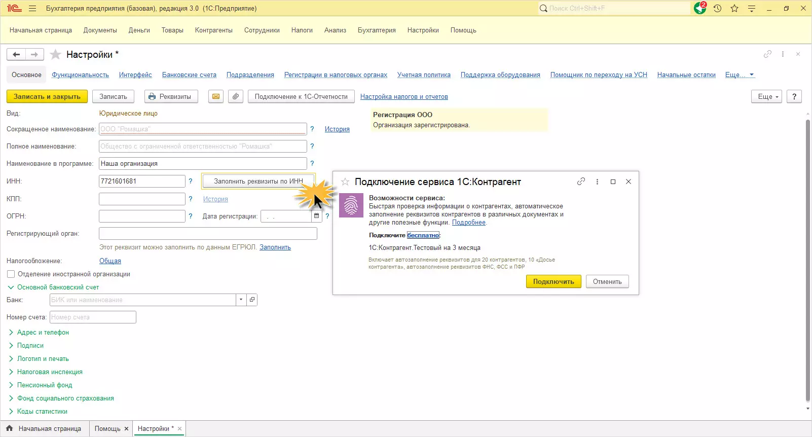 Вариант 2. Заполнить автоматически можно при подключенном сервисе 1С:Контрагент. Для этого достаточно нажать на кнопку «Заполнить реквизиты по ИНН».