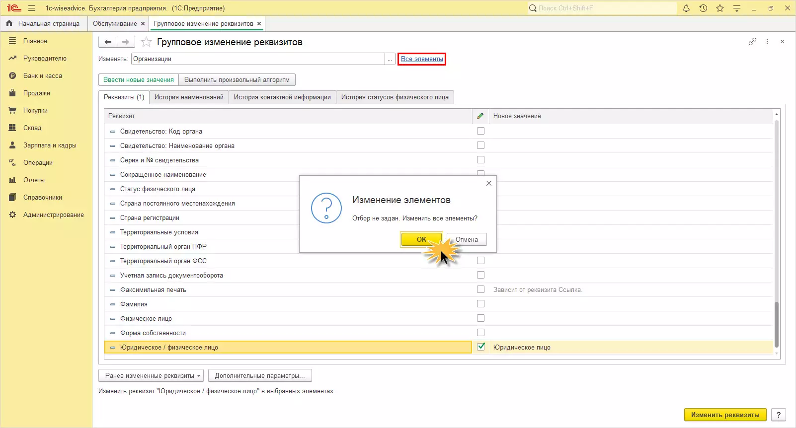 Обратите внимание, что в нашем примере организация одна и мы ее только внесли. Программа перед изменением предупредит, что отбор не задан, и предложит подтверждение действий. Если у вас в информационной базе несколько организаций, отметьте нужную, перейдя по строке-ссылке «Все элементы» – это отбор.
