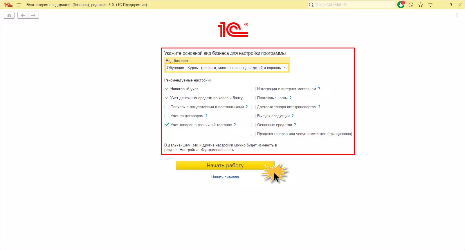Окно 6. Установите галочки-настройки, ориентируясь на деятельность компании. Нажмите «Начать работу».