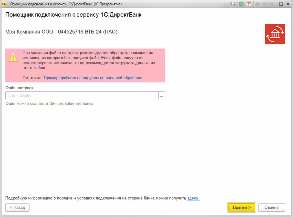 Для загрузки настроек из файла их нужно выгрузить из личного кабинета банка или запросить у технической поддержки банка, выбрать соответствующий пункт в помощнике и загрузить полученный файл.