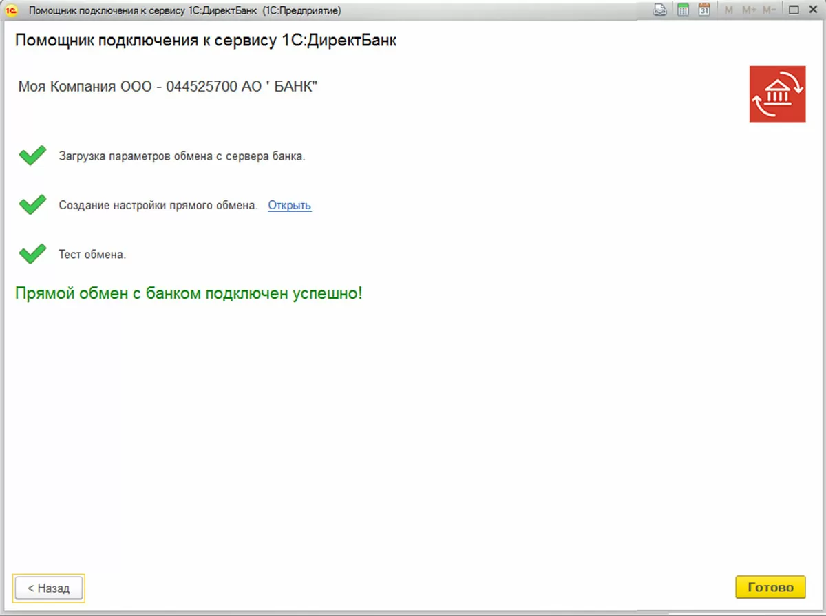 При успешном тестовом обмене будет выведено сообщение: «Тест выполнен успешно!». Если вас заинтересовали возможности работы с 1С:Директ Банк, мы предлагаем продолжить знакомство с данной темой и узнать, как произвести настройку выписок банка в 1С в популярнейшей программе 1С:Бухгалтерия.