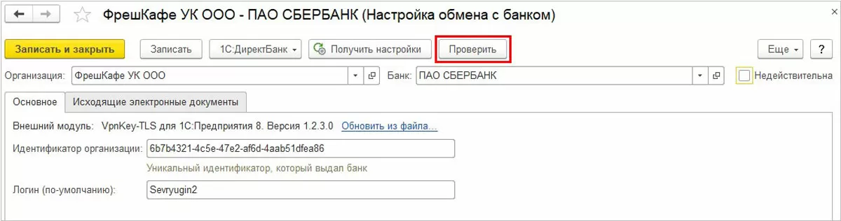 Если вы все же решили действовать самостоятельно при возникновении ошибки обмена с банком в сервисе 1С:Директ Банк, следует использовать механизм проверки соединения. Тестовый обмен с банком запускается кнопкой «Проверить» в настройках обмена с банком.