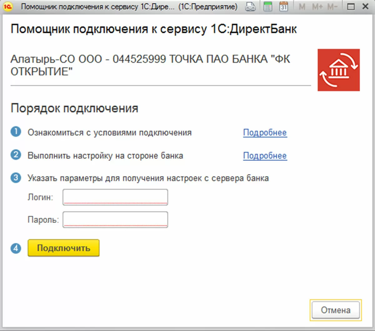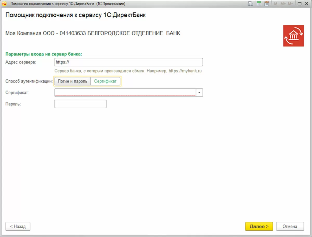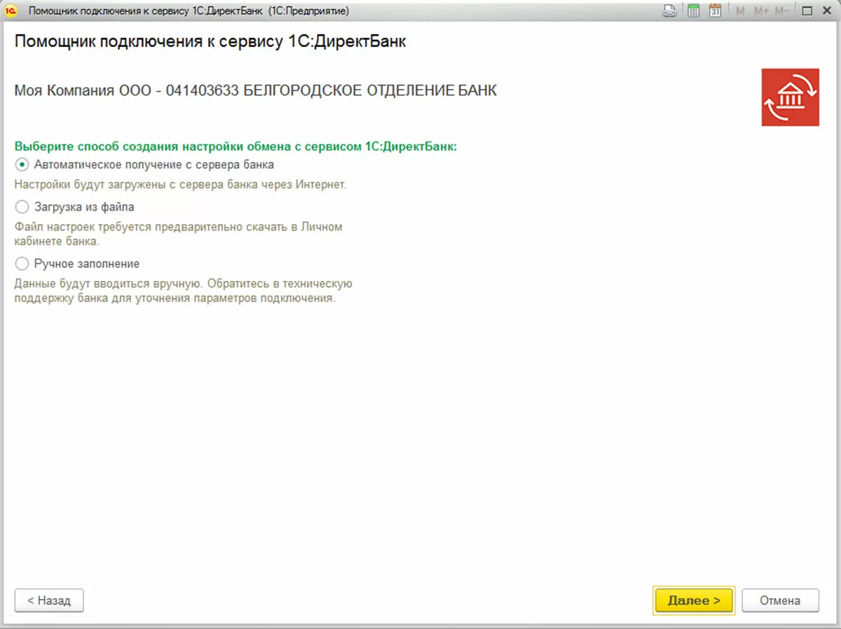 Самое простое и самое быстрое подключение происходит при использовании механизма автоматического получения настроек. Он потребует ввести данные личного кабинета юрлица в Банке, указать адрес сервер банка, способ аутентификации. После этого все необходимые настройки будут сформированы автоматом.