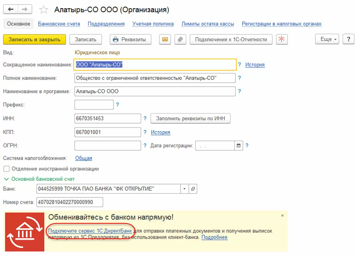 Чтобы запустить помощник запуска настроек 1С:Директ Банк, нажмем на ссылку подключения сервиса в карточке организации или в карточке счета организации.