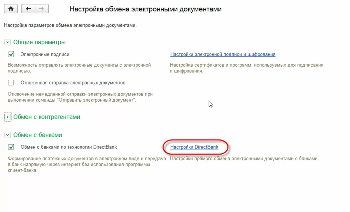 Сервис 1С:Директ Банк предусматривает несколько вариантов настройки прямого обмена с банком:
