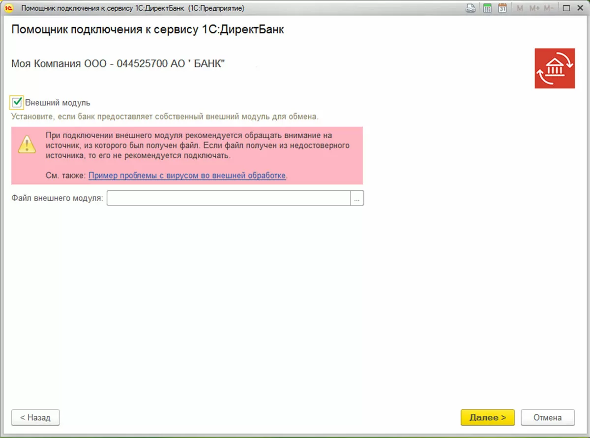 Ручное заполнение подразумевает, что все параметры для подключения необходимо запросить в технической поддержке банка. В рамках этого формата реализована возможность подключить взаимодействие с банком с использованием внешнего модуля, поставляемого банком.