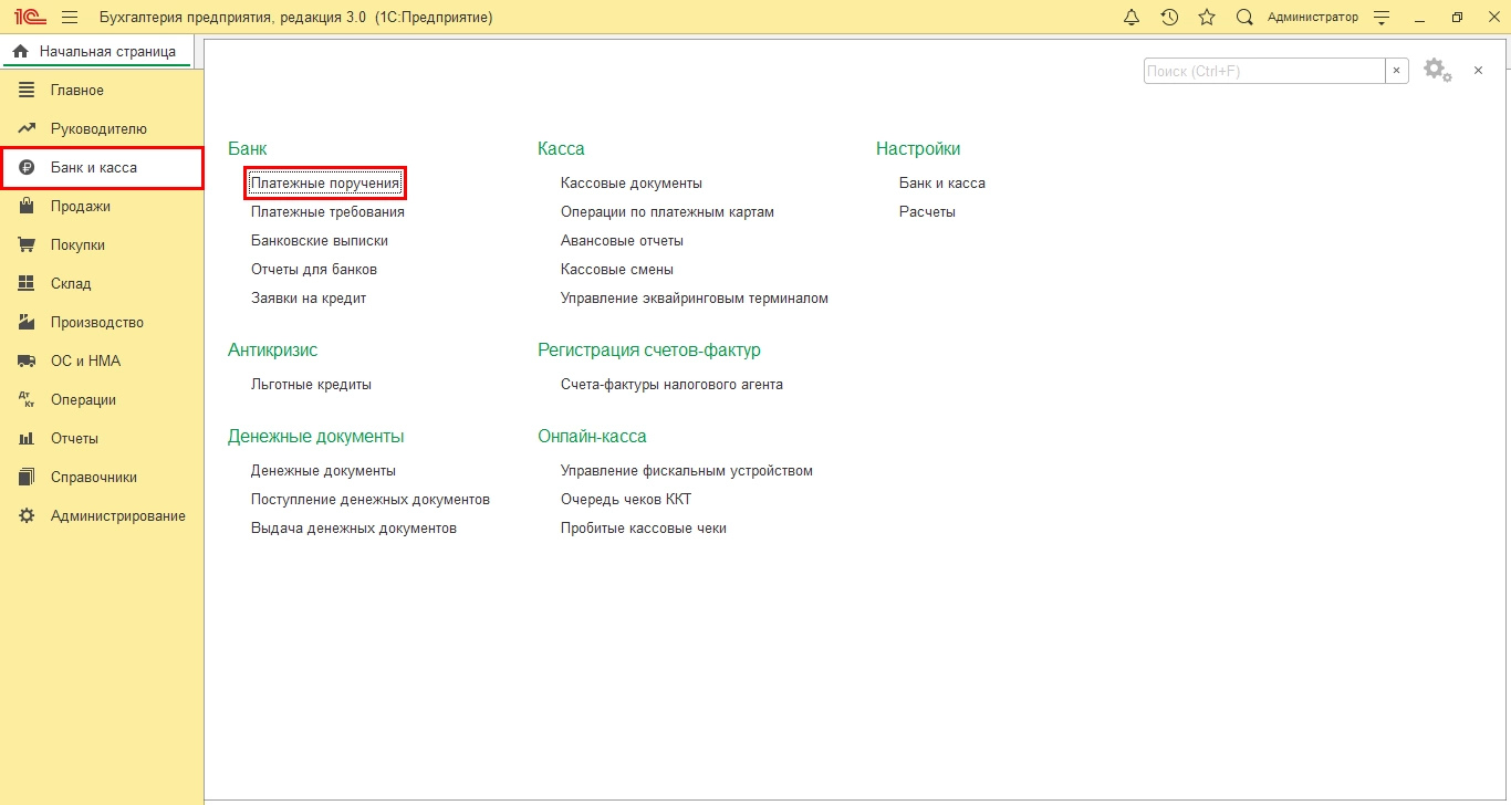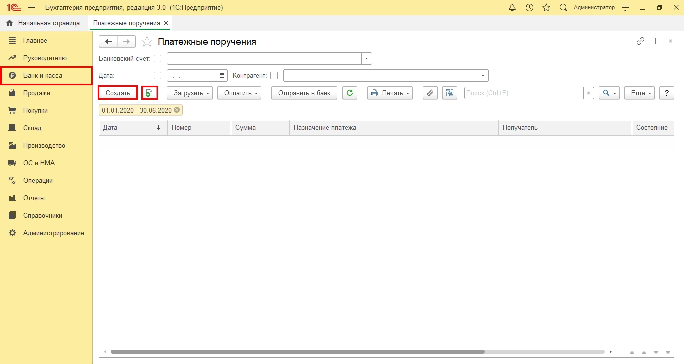 Шаг 1. Перейдите в раздел «Банк и касса-Платежные поручения».