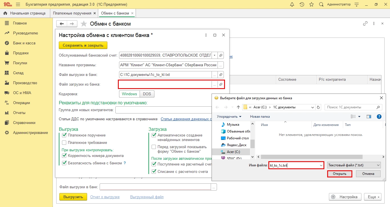 Шаг 5. Укажите файл загрузки для обмена данными с банком. Файл загрузки имеет имя kl_to_1С (из клиент-банк в 1С).