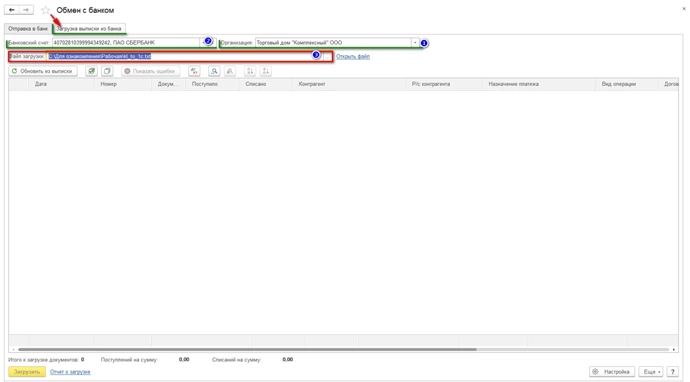 - Прописываем имя файла, откуда загрузятся операции по р/сч, и файла, в который загрузятся;