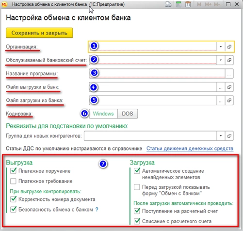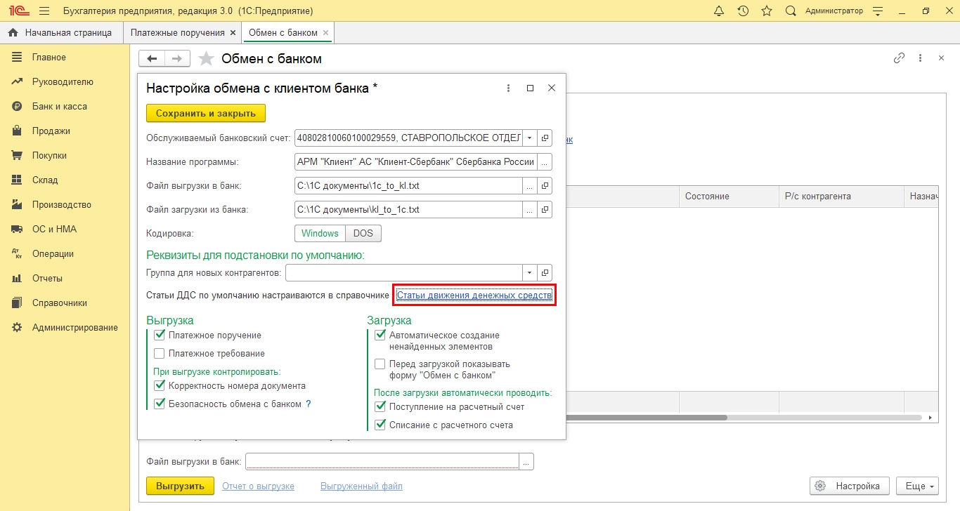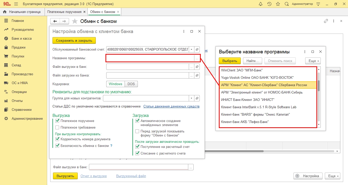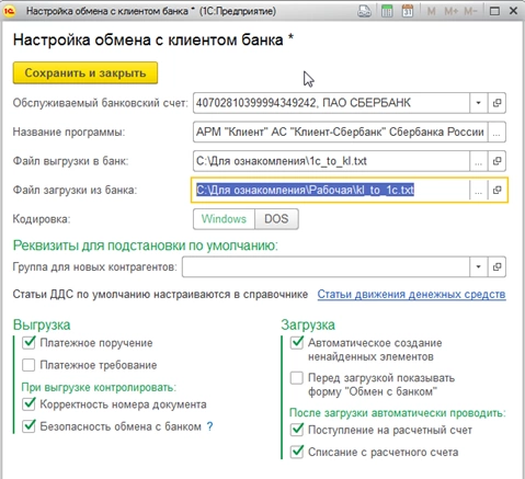 - Кодировка. 1С 8.3 может обмениваться форматами DOS и Windows, поэтому указываем кодировку, соответствующую клиент-банку.
