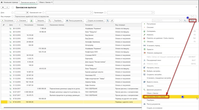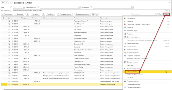 Чтобы загрузить или выгрузить из клиент-банка документы, в журнале «Банковские выписки» жмем «ЕЩЕ-Обмен с банком».