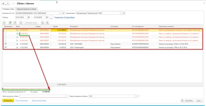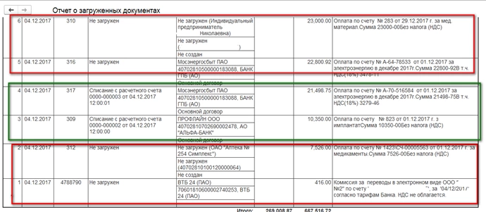 После этого табличная часть заполняется документами, при этом красный шрифт означает, что либо он некорректно заполнен, либо платежка недействительна. Черный цвет говорит о том, что заполнение корректное, можно делать выгрузку в файл банк-клиент.