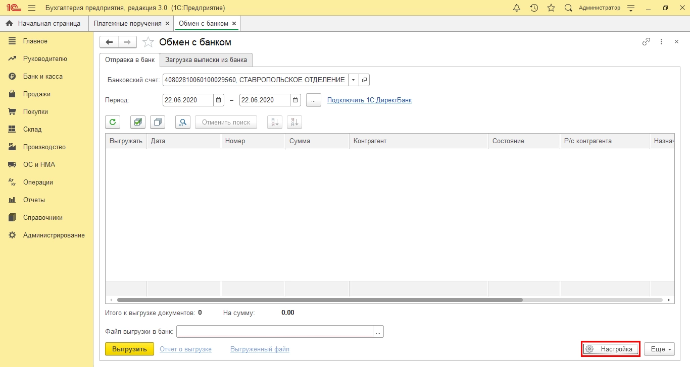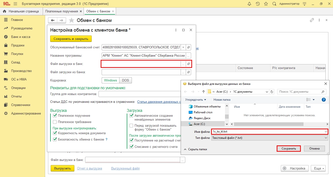 Настройка выполнена, можно перейти к отправке платежек в банк. После настройки, имя файла выгрузки указывается автоматически.