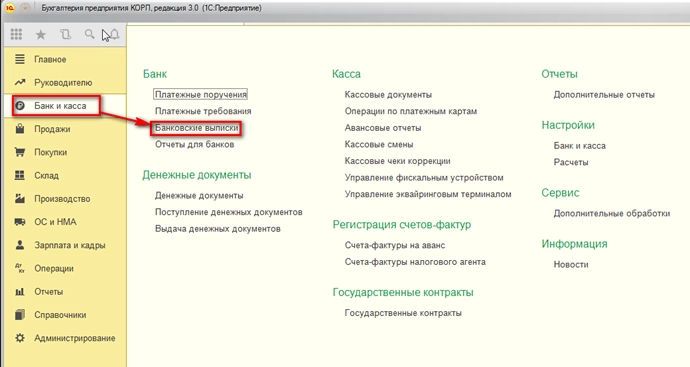 Чтобы настроить обмен с клиент-банком в 1С Бухгалтерии 8.3, можно обратиться к нашим специалистам по сопровождению 1С, или произвести настройки самостоятельно, начав с открытия « Банк и касса-Банковские выписки»