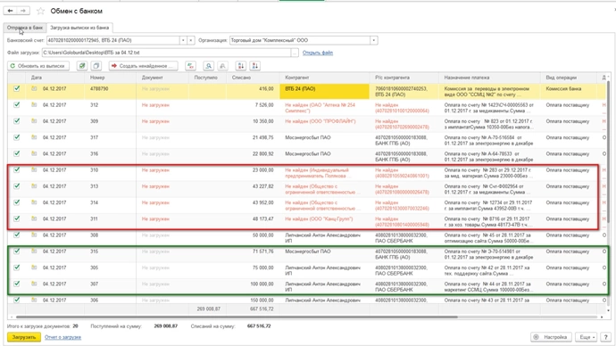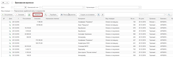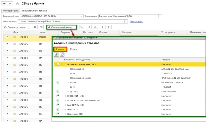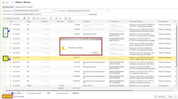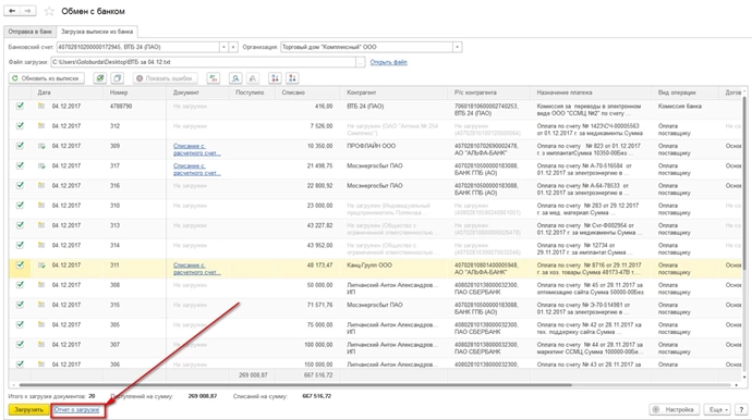 Создав ненайденные объекты, выбираем проставлением галочки документы из выписки, которые мы хотим загрузить. Жмем «Загрузить».