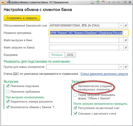 - В Загрузках справа активируем автоматическое создание ненайденных элементов (т.е. при загрузке выписки программа автоматически будет создавать контрагентов, договора, р/сч, которые она не нашла в справочниках ), а также демонстрацию формы «Обмен с банком» перед загрузкой.