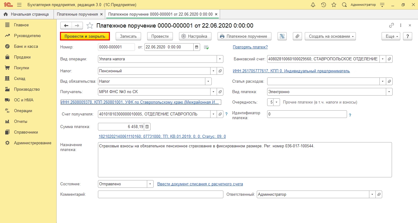 Платежное поручение сформировано. Следующий шаг – выгрузка платежек, который предполагает, что подключить клиент-банк удалось ранее. Обмен данными с банком выполняется из журнала «Платежные поручения» по кнопке «Отправить в банк».