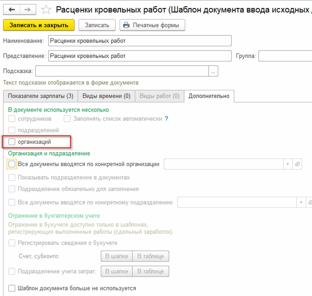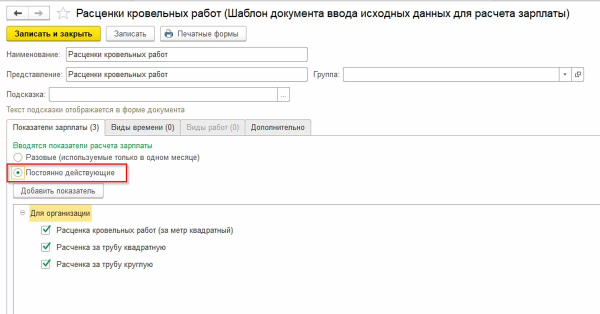 После установки флажка «Постоянно действующее» в документе появятся наши постоянные показатели. Остается выбрать их и записать шаблон.