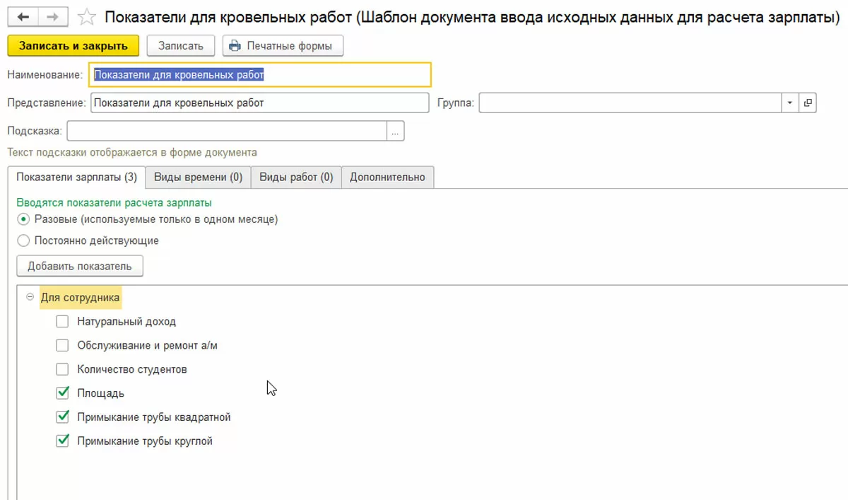 Заказать консультацию по нестандартным расчетам с сотрудниками в 1С:ЗУПСоздадим еще один шаблон для ввода данных по выработке. Здесь мы используем разовые показатели.