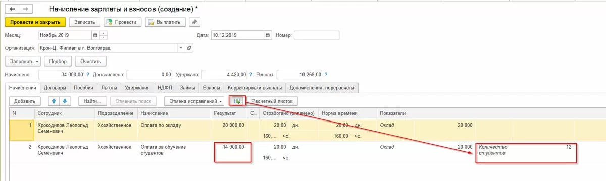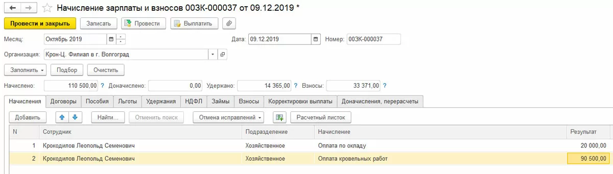 В расчете зарплаты нажимаем кнопку «Заполнить». У Крокодилова заполняется 2 строки.