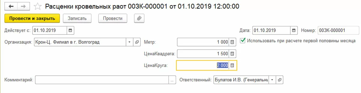 Вводим документ «Данные для расчета зарплаты» вида «Показатели для кровельных работ».