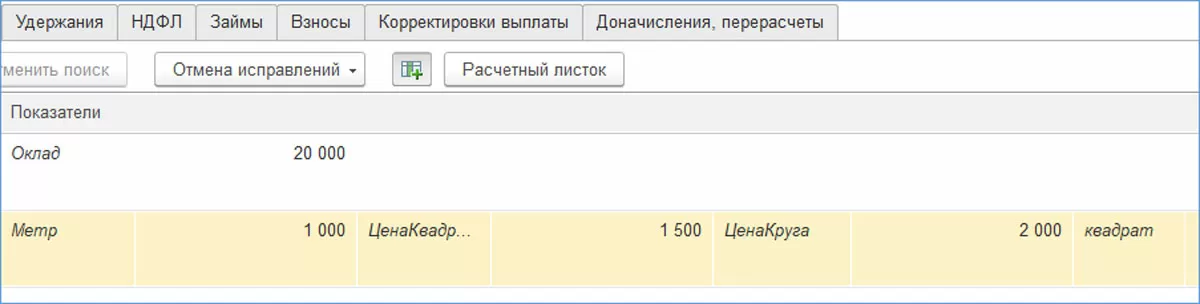 Так как при настройке показателя мы установили, что он «накапливается по отдельным значениям документами ввода данных для расчета зарплаты», то при расчете вознаграждения эти 2 документа должны дать общую сумму: 10 м2 площади, 23 квадрата и 23 круга.