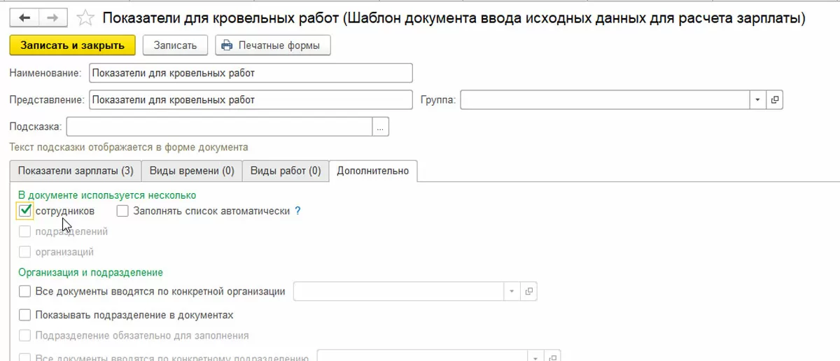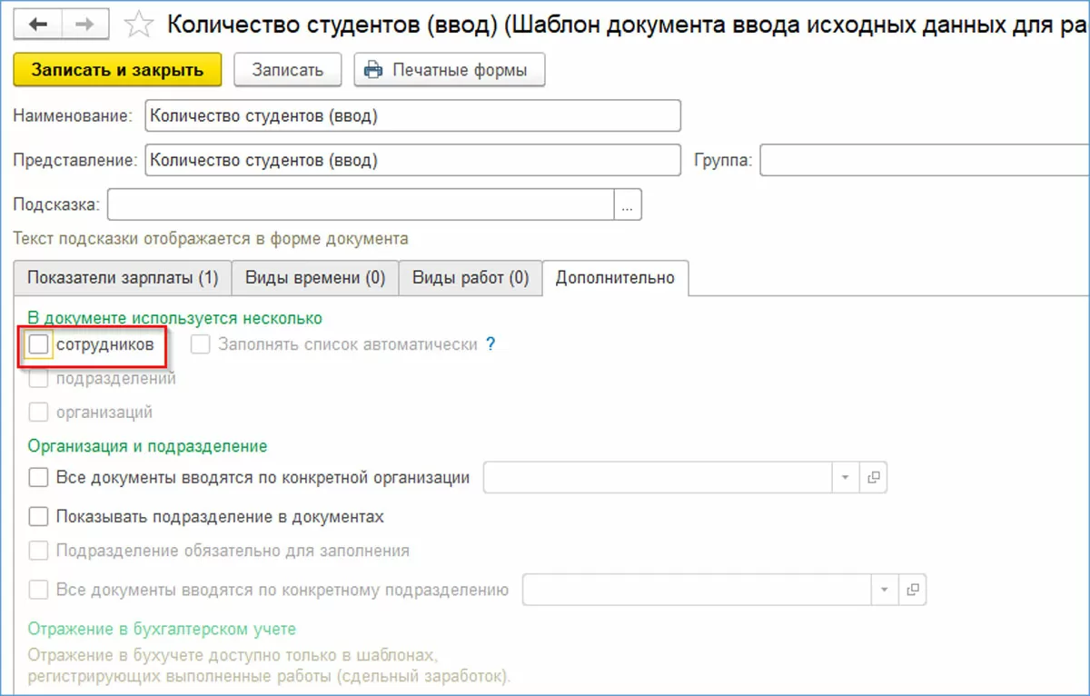 На закладке «Дополнительно» установим возможность ввода данных для нескольких сотрудников.