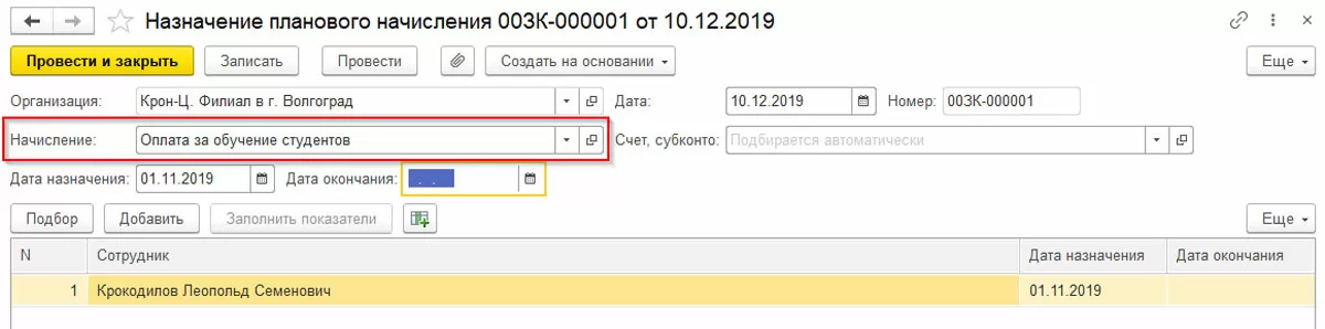В этом примере не обойтись без назначения планового начисления. Это можно сделать с ноября 2019 года документом «Назначение планового начисления».