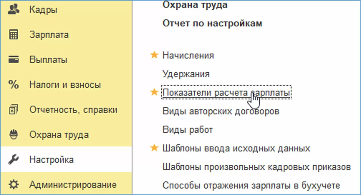Все наши настройки включают настройку показателей, шаблонов ввода этих показателей и начислений. Используется меню «Настройка»: