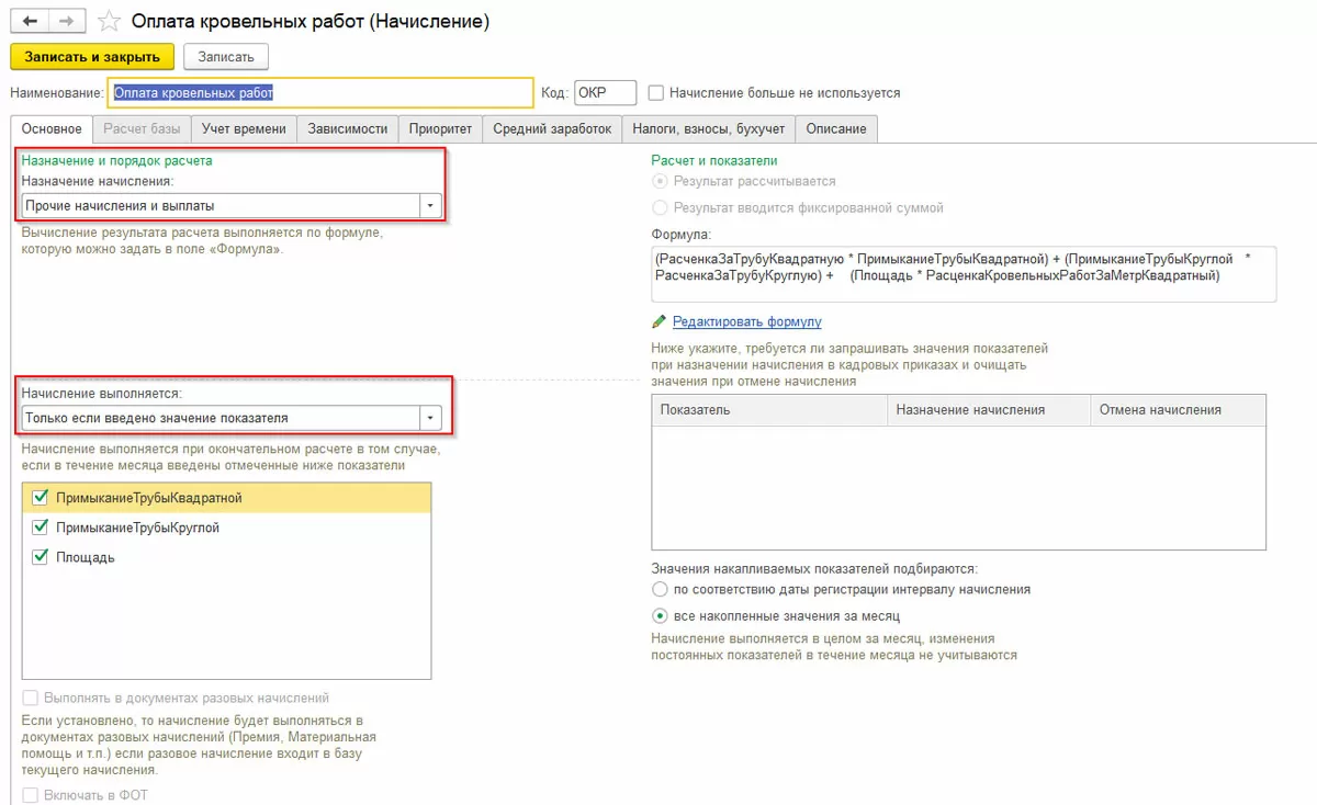 Для расчета вознаграждения за кровельные работы нужно составить формулу расчета. Для этого необходимо создать начисление.