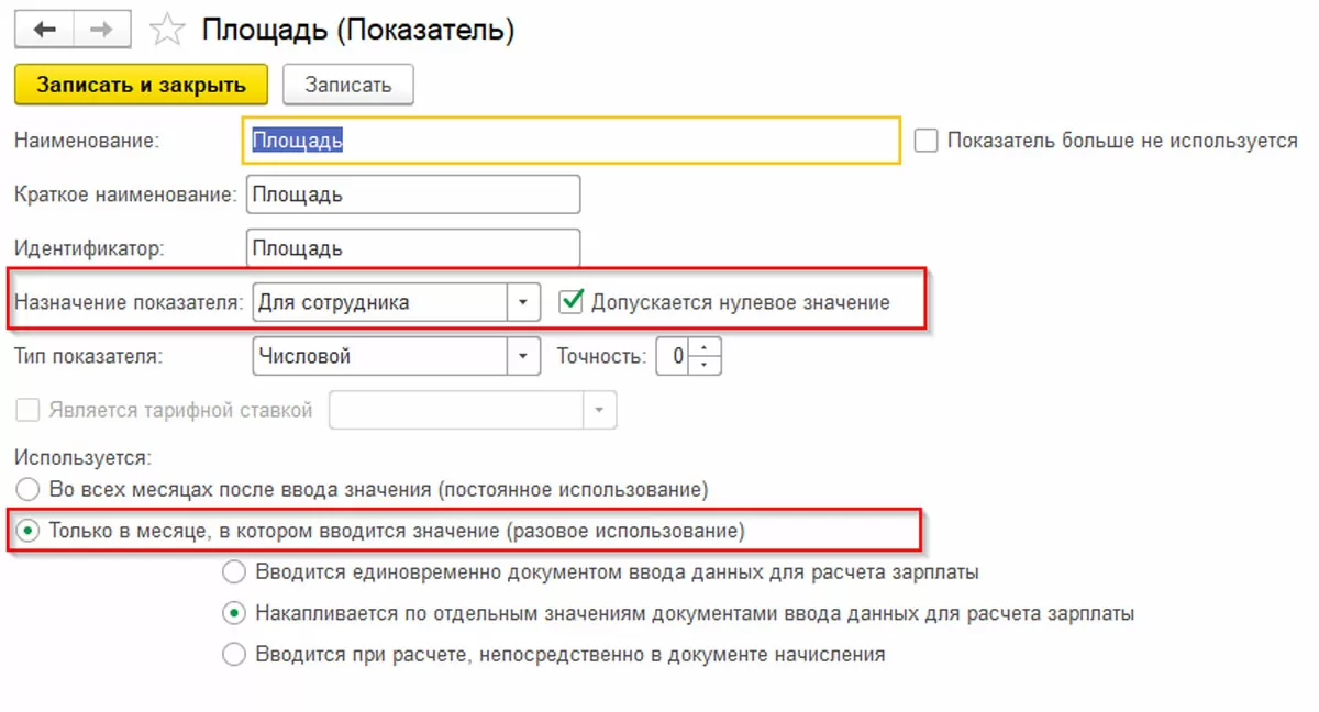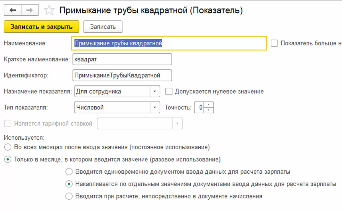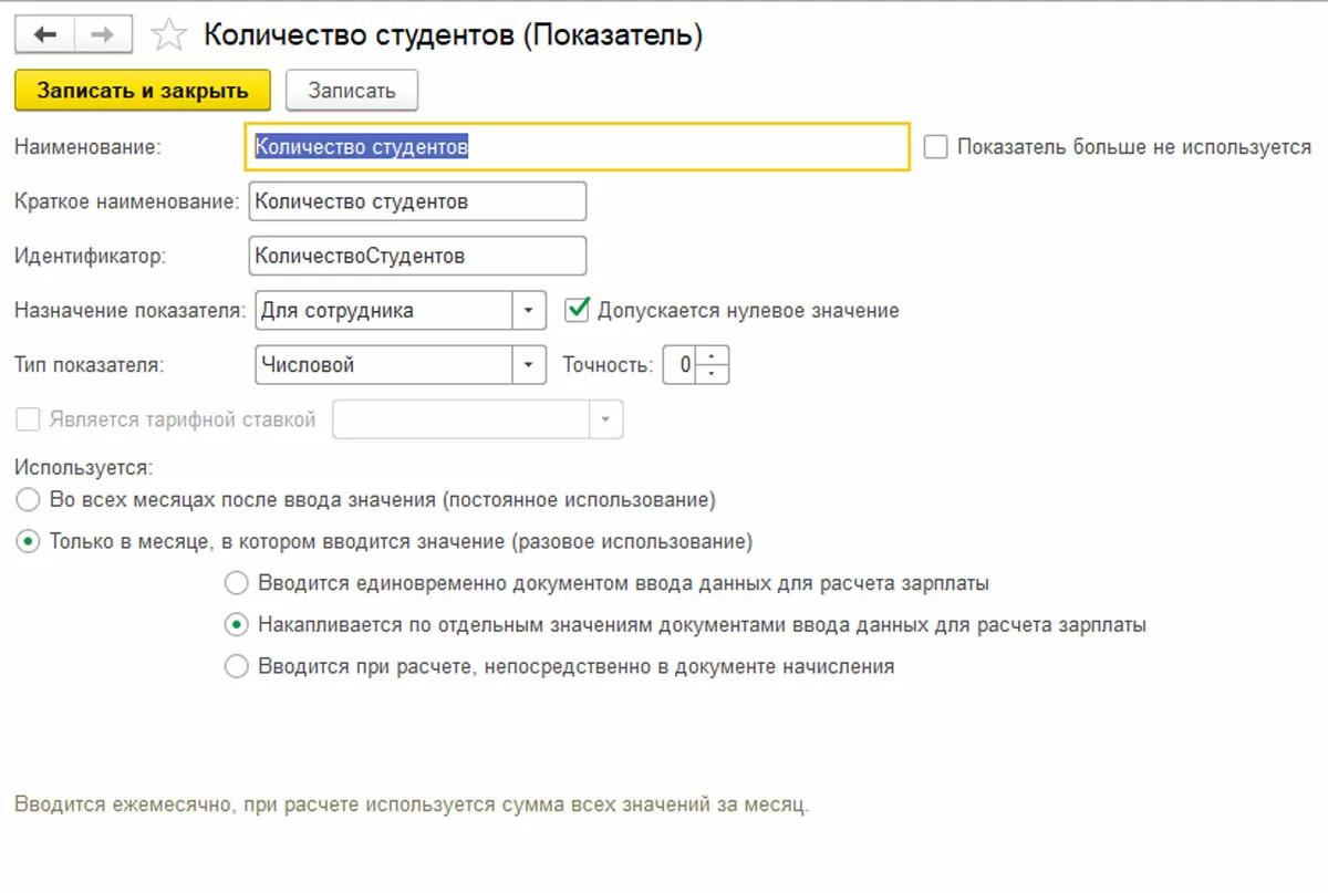 Мы вводим его для сотрудника каждый месяц. Обратите внимание, мы используем «накапливаемый показатель», то есть данные по этому показателю могут вводиться несколькими документами, которые относятся к различным датам. При этом данные должны складываться по всем документам рассчитываемого месяца.