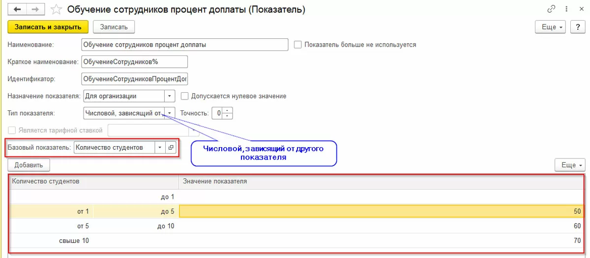 Как только тип поменялся на «Числовой, зависящий от другого показателя», появилось поле «Базовый показатель» для определения того самого «другого показателя». Появилась возможность ввести «ступенчатую» зависимость от количества студентов. Кстати, если бы зависимость была бы линейная, можно было ее ввести непосредственно в формулу расчета.