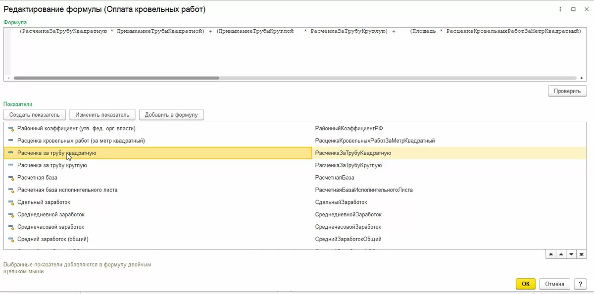 В качестве «Назначения» укажем «Прочие начисления и выплаты». Рассчитываться начисление будет при условии, что введены значения показателей по примыканию труб или площадь возведенной кровли. Главное: ввести формулу. При нажатии на кнопку «редактировать формулу» попадаем в меню, где можно составить любую формулу с применением всех наших показателей.