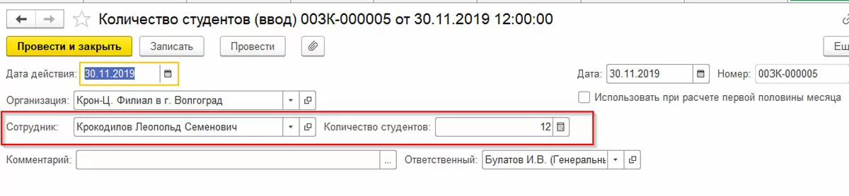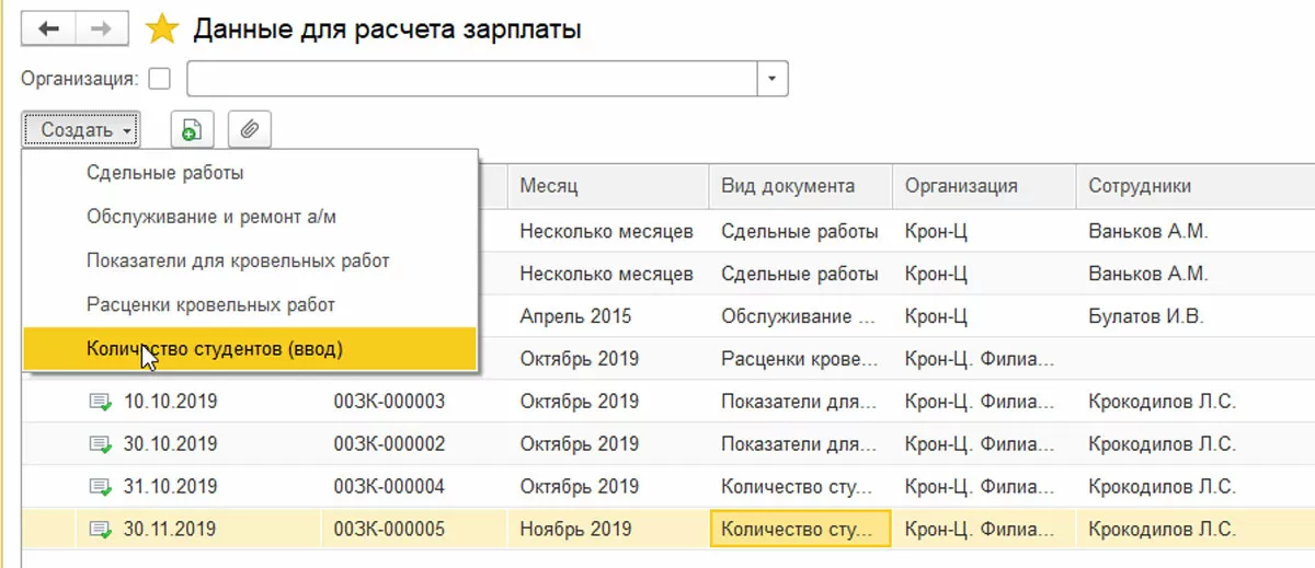 Для того, чтоб ввести данные по количеству обучающихся студентов, нужно заполнить документ «Данные для расчета зарплаты» вида «Количество студентов (ввод)». Напомню, что этот вид документа появляется сразу после проведения шаблона с этим наименованием.