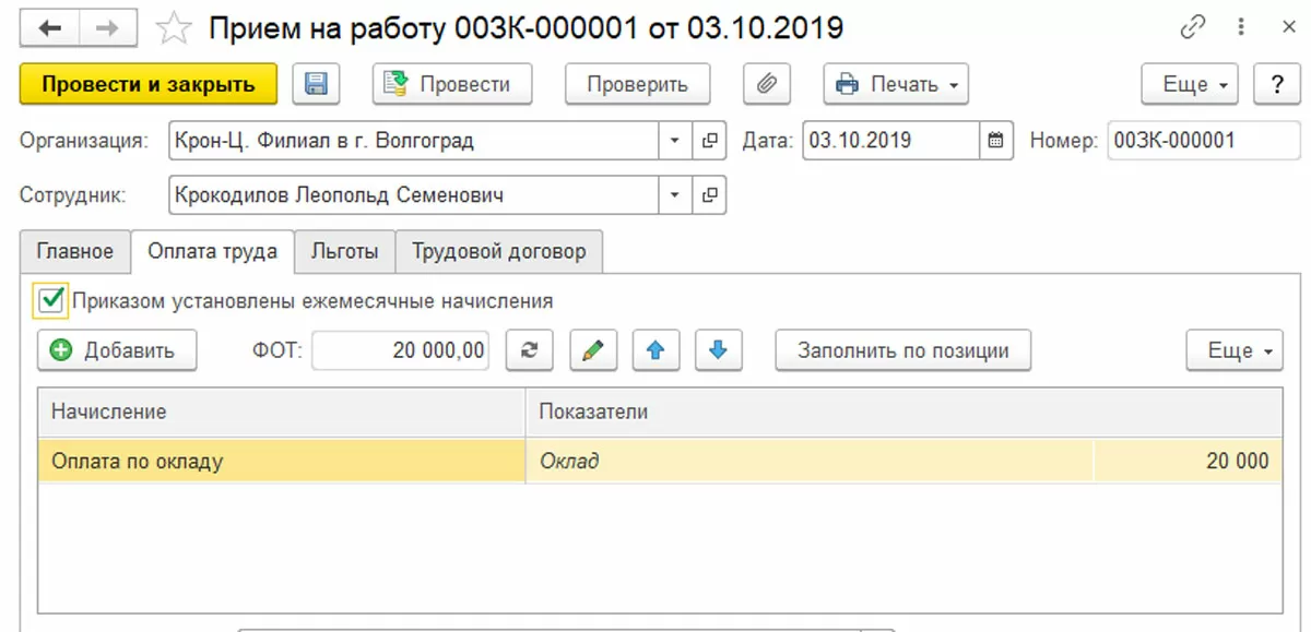 Здесь заполняется всего 3 поля, каждое из которых относится к определенной работе. Теперь заполним данные по выработке сотрудника. Сотрудник Крокодилов принят на работу в октябре 2019 года на оклад. Никаких данных о дополнительной оплате в документе приема не содержится.