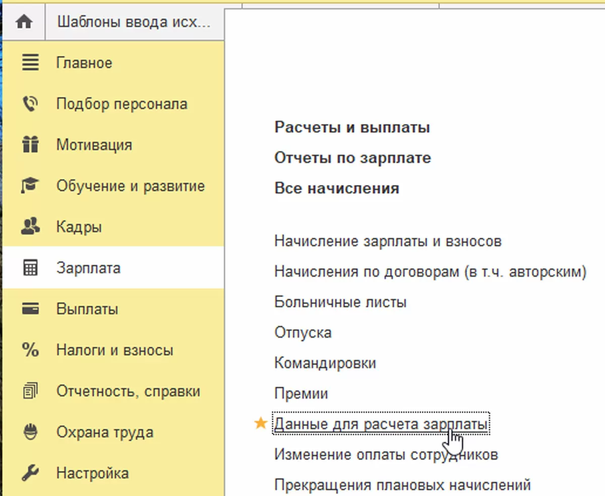 Для ввода формы документа используется еще один документ, который называется «Шаблон ввода исходных данных». Он находится в разделе «Настройки». Каждый шаблон относится к определенному виду документа «Данные для расчета зарплаты».